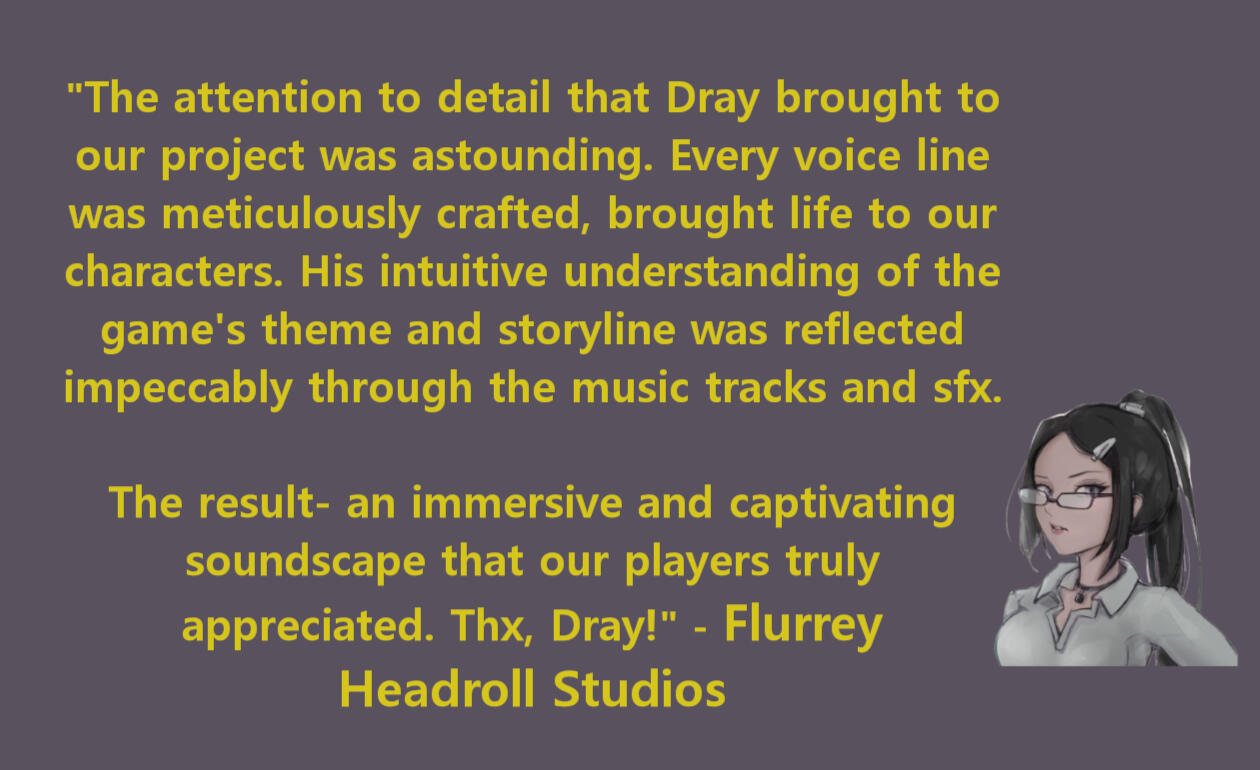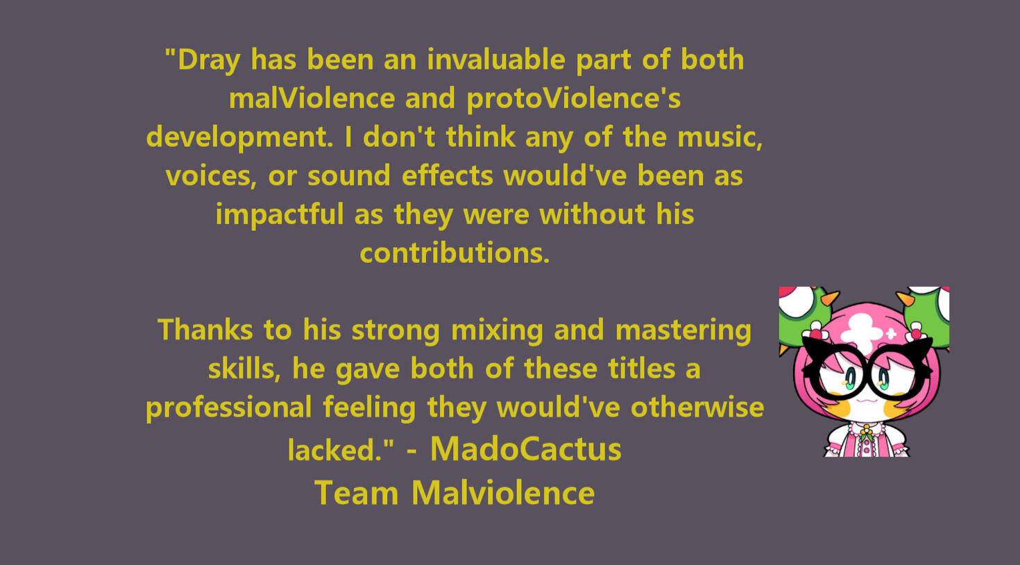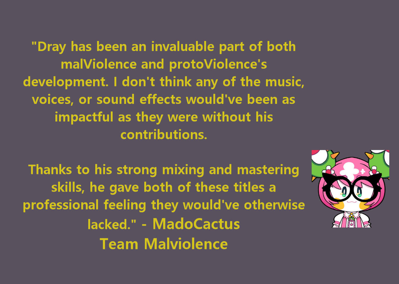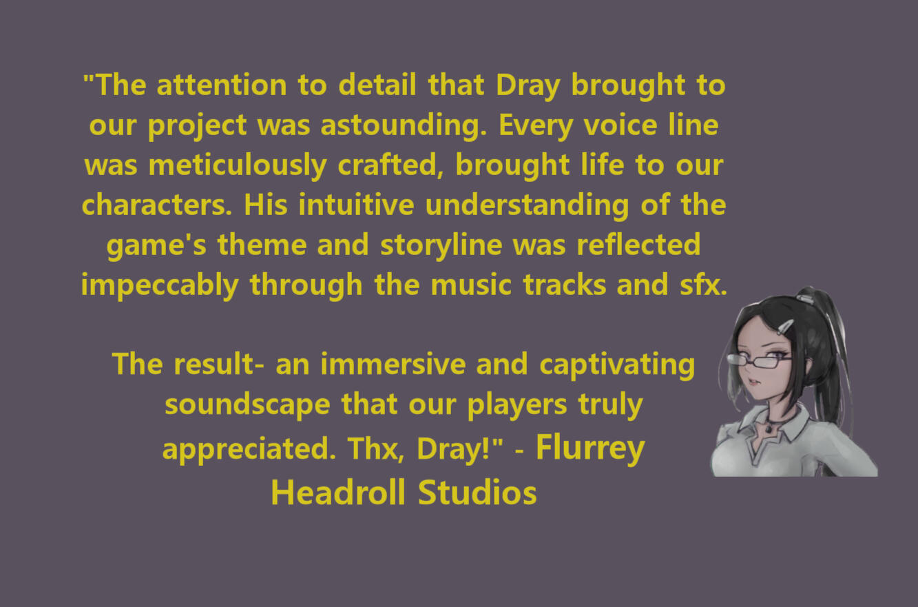 Hello! My name is Dray, (also known as D.ray). I am the sound director and audio engineer behind EGA studios.I have 10 years working in audio with 5 of those years working on indie games. In that time I have worn many hats including being a composer, mixer, editor, sound designer and mastering engineer. Apart from the gaming space I have worked on audiobooks, video audio, podcasts and music production.I now take all that experience and knowledge and apply it to game projects. I work with indie game devs to help bring their projects to life.When I'm not working on games, I enjoy listening to J-pop, watching horror movies and drinking bubble tea.